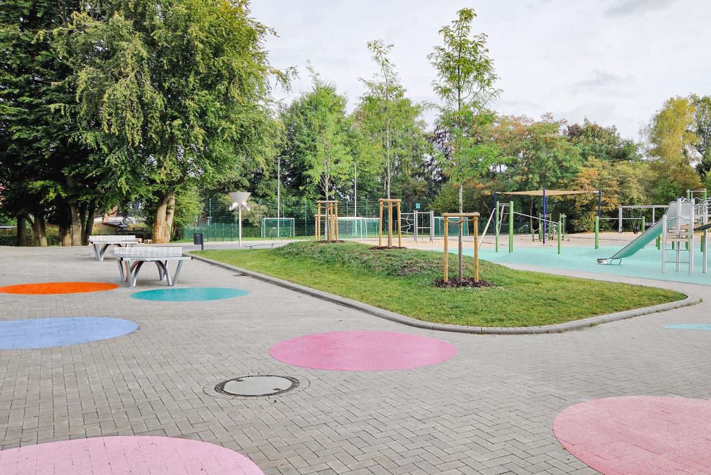 und freien Entfaltung entstanden. Angrenzend an den neuen Spielmittelpunkt im Westen ist ein Rasen-Fußballplatz entstanden, welcher mit vier Toren und einer langen Sitzstufe als Tribüne zum Spielen und Zugucken animiert. Die verbleibenden Inseln des Schulhofes wurden begrünt, und mit Bäumen als Schattenspender bepflanzt, sowie vereinzelt mit Sitzsteinen ausgestattet. Der nördlich gelegene Bestandshügel wurde zu