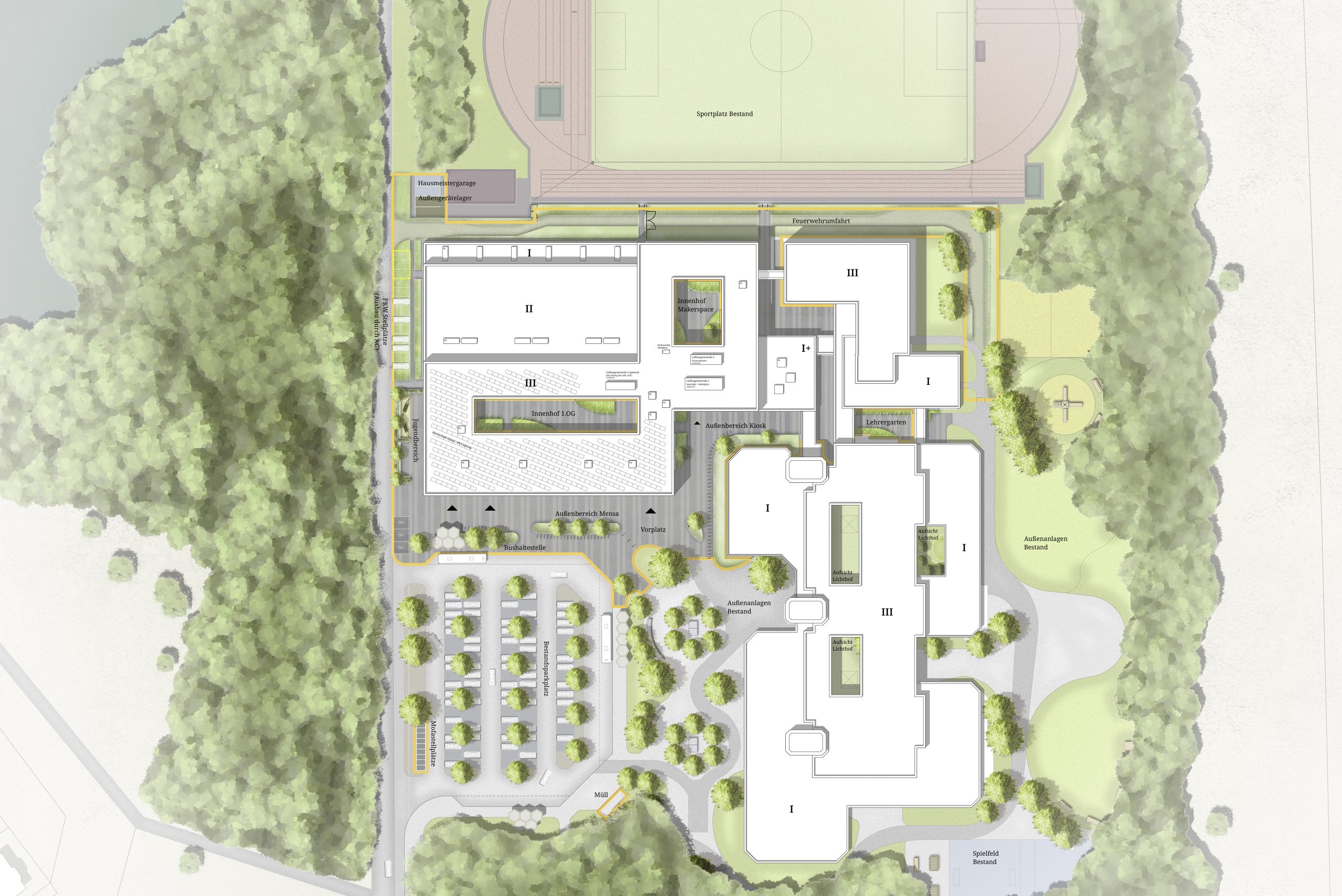 Der bestehende Schulcampus in Isernhagen wird mit einem Neubau ergänzt. Die umgrenzenden, neuen Außenanlagen binden den neuen Baukörper an die bestehenden Flächen an. Ein besonderer Augenmerk in der Konzeption liegt auf dem Aspekt der Adressbildung. Der Neubau erhält eine befestigte Vorzone als Entrée zur Lenkung der Schülerströme und Abwicklung des ÖPNV-Verkehrs. Der Neubau erhält zudem Licht- und Innenhöfe als zusätzliche Aufenthaltsflächen. Sie fungieren u.a. als Lern- und Kommunikationsbereiche oder können für weitere schulische Aktivitäten genutzt werden.
