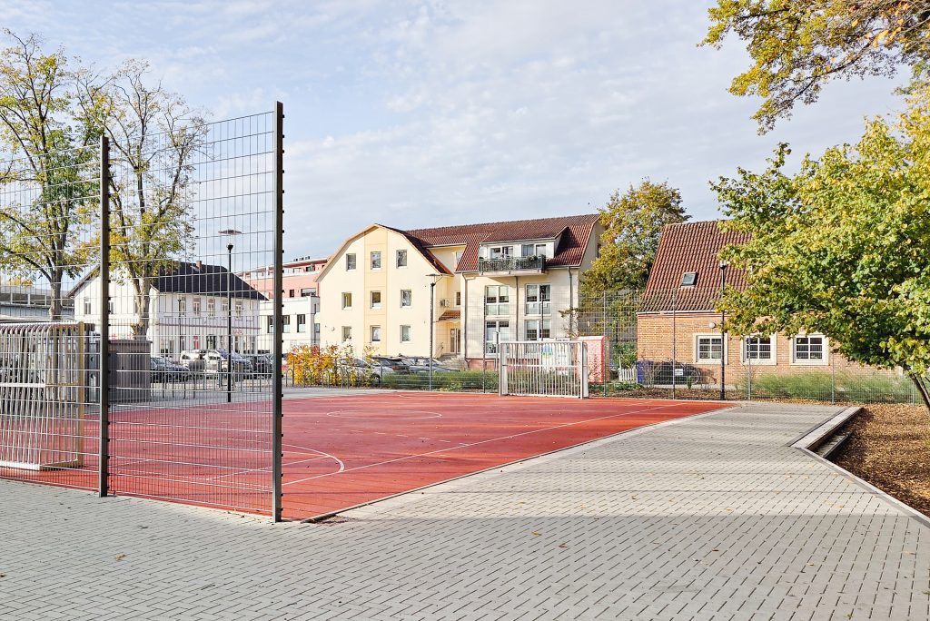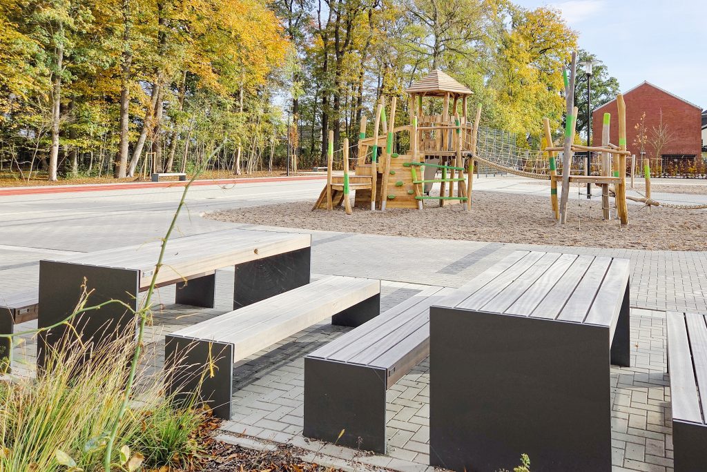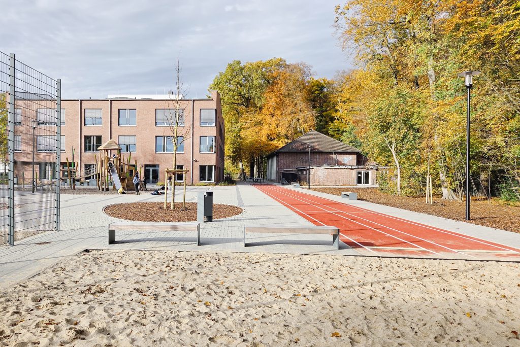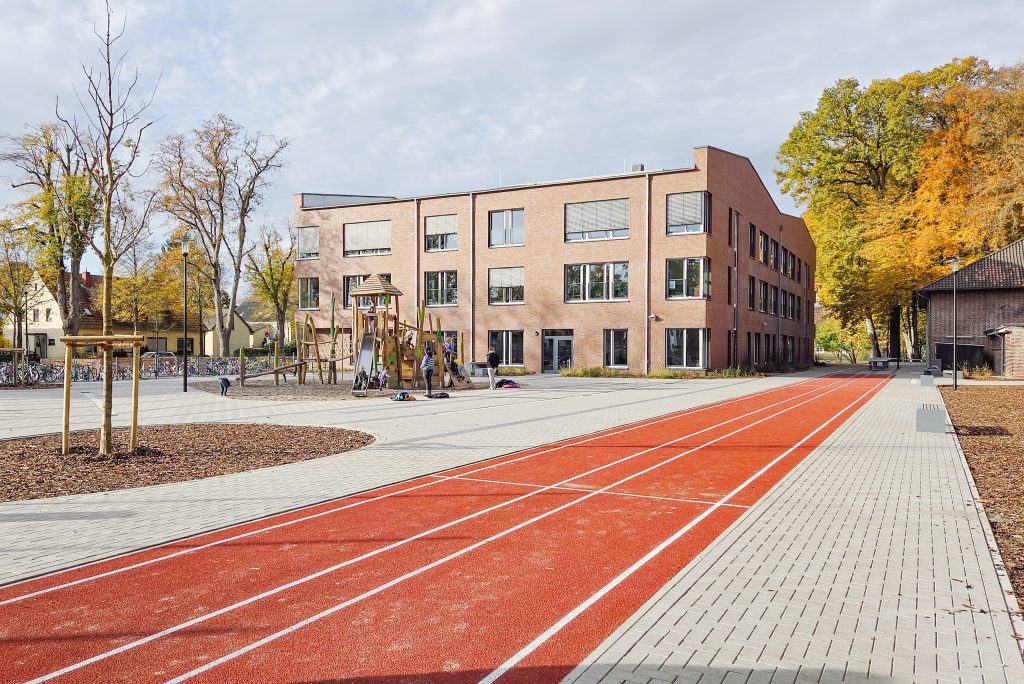 Die Gemeinde Lilienthal nördlich von Bremen hat einen Ersatzneubau der Grundschule auf dem Bestandsgrundstück realisiert. Das Konzept für die Außenanlagen wurde unter dem Motiv „Schule am Wald“ entwickelt. Durch die Errichtung des Ersatzneubaus kommt es zu einer vollständigen Änderung der städtebaulichen Struktur. Der neue Gebäudekörper liegt zentral verortet auf dem Baugrundstück. Die rückwertige Waldbereich bildet eine starke räumliche Kante und räumliche Zäsur auf dem Grundstück. Die Bestandsbäume wurden dabei behutsam in die Neuplanung integriert. Das Motiv eines organisch gestalteten Abschlusses der Pflasterflächen zum Baumbestand unterstreicht diese Anbindung. Die gebäudenahen Schulhofbereiche, sowie die funktional notwendigen Verkehrsflächen für Verkehr und Erschließung lehnen sich an die orthogonale Struktur des Neubaus an und stellen so einen entsprechenden Bezug her. Die neuen Außenanlagen der Grundschule umfassen neben Funktionsbereichen für den ruhenden Verkehr (Fahrräder und PKWs) weiträumige Spiel- und Sportflächen. Das Entrée zum Neubau ist geprägt durch eine große Baumallee. Den Abschluss zur angrenzenden Straße „Kronenhof“ bildet ein Holzzaun mit einer unterpflanzung der Bestandsgehölze. Auf dem Schulhof wurde ein Kleinspielfeld, Bolzplatz sowie eine Sprint- und Weitsprunganlage realisiert. Neue Spielgeräte sowie Tisch-Bank-Kombinationen dienen als Spiel- und Pausenangabeot für die Schüler*innen.