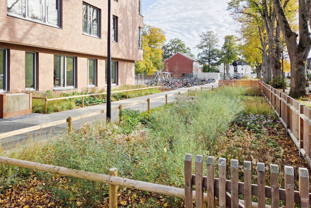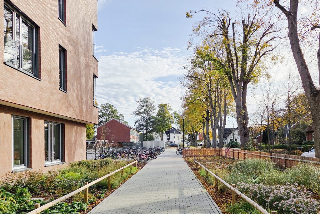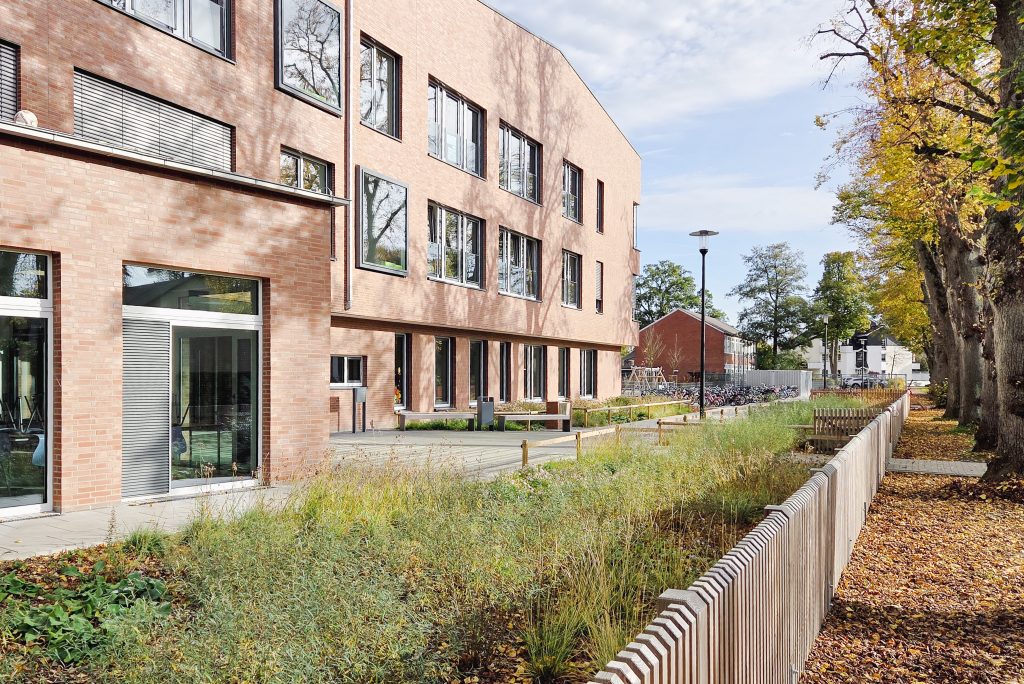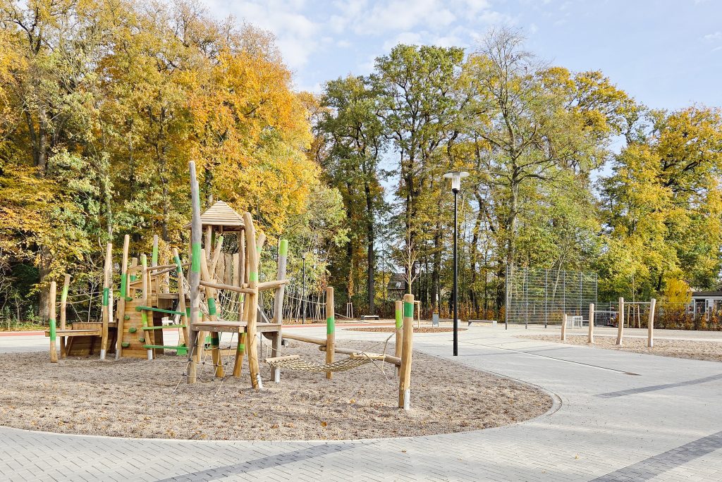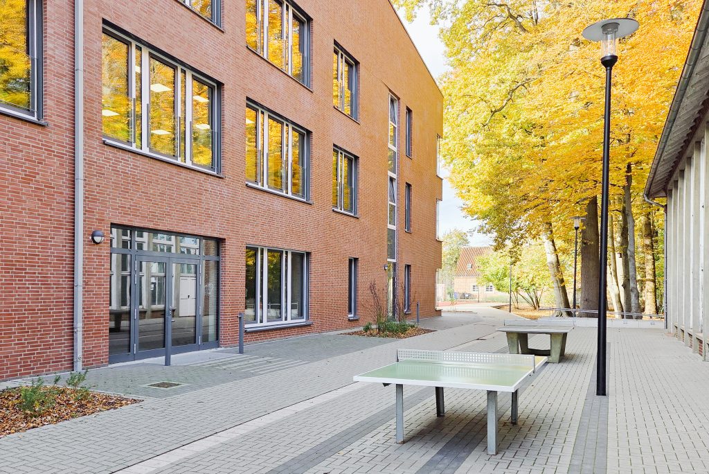 Die Gemeinde Lilienthal nördlich von Bremen hat einen Ersatzneubau der Grundschule auf dem Bestandsgrundstück realisiert. Das Konzept für die Außenanlagen wurde unter dem Motiv „Schule am Wald“ entwickelt. Durch die Errichtung des Ersatzneubaus kommt es zu einer vollständigen Änderung der städtebaulichen Struktur. Der neue Gebäudekörper liegt zentral verortet auf dem Baugrundstück. Die rückwertige Waldbereich bildet eine starke räumliche Kante und räumliche Zäsur auf dem Grundstück. Die Bestandsbäume wurden dabei behutsam in die Neuplanung integriert. Das Motiv eines organisch gestalteten Abschlusses der Pflasterflächen zum Baumbestand unterstreicht diese Anbindung. Die gebäudenahen Schulhofbereiche, sowie die funktional notwendigen Verkehrsflächen für Verkehr und Erschließung lehnen sich an die orthogonale Struktur des Neubaus an und stellen so einen entsprechenden Bezug her. Die neuen Außenanlagen der Grundschule umfassen neben Funktionsbereichen für den ruhenden Verkehr (Fahrräder und PKWs) weiträumige Spiel- und Sportflächen. Das Entrée zum Neubau ist geprägt durch eine große Baumallee. Den Abschluss zur angrenzenden Straße „Kronenhof“ bildet ein Holzzaun mit einer unterpflanzung der Bestandsgehölze. Auf dem Schulhof wurde ein Kleinspielfeld, Bolzplatz sowie eine Sprint- und Weitsprunganlage realisiert. Neue Spielgeräte sowie Tisch-Bank-Kombinationen dienen als Spiel- und Pausenangabeot für die Schüler*innen.