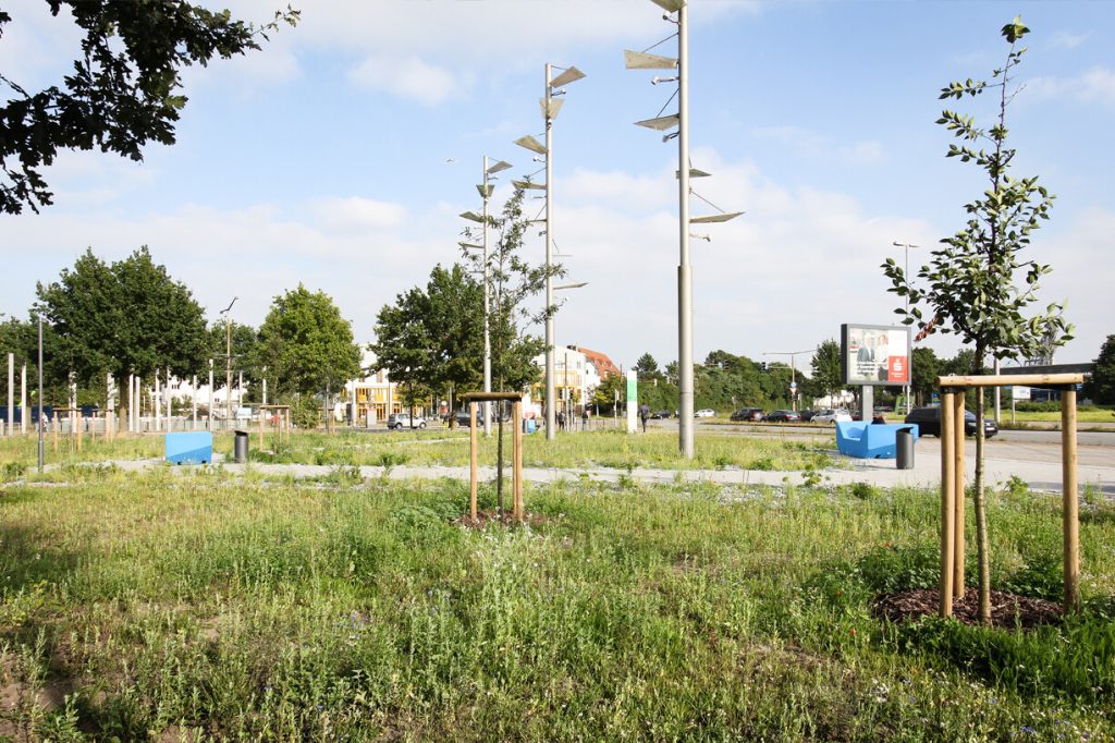 Revitalisierung einer ehem. Parkplatzfläche die auf Grund des Neubaus einer Park+Ride Anlage nicht mehr genutzt wurde. Durch den Umbau und die Entwicklung hin zu einem Pocket-Park konnte nicht nur eine deutliche Reduzierung der Flächenversiegelung erreicht werden, sondern auch zusätzliche ökologische Aspekte zur Umsetzung eines grünen Trittsteins innerhalb der bestehenden Stadtlandschaft umgesetzt werden. Der sich gabelnde Hauptweg wird von einem Band aus Wildstauden begleitet. Wiesenflächen mit einem hohen Kräuteranteil und neuen Baumpflanzungen bilden den weiteren Rahmen. An den Bestandsbäumen wurden Nistkästen montiert und Insektenhotels innerhalb der Wiesenflächen aufgestellt. Die Möblierung mit blauen Enzis verweist auf die noch in Planung befindlichen Grün-blauen Wege als übergeordnete Wegeachse innerhalb von Gröpelingen.